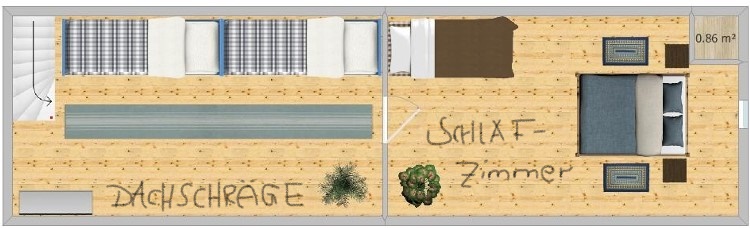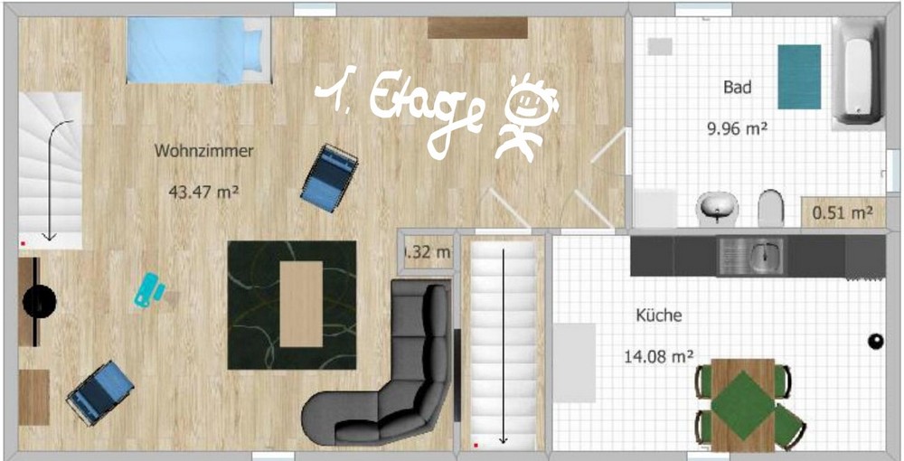 einem Schlafzimmer und einem Kinderzimmer (insgesamt 75 m² groß).